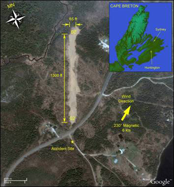 On the day of the flight, the pilot intended to conduct some practice in the local area. The sky was clear and the wind direction was approximately 230 degrees magnetic at less than 10 knots. The dirt airstrip runway orientation is 200 degrees/020 degrees magnetic and it is approximately 1300 feet long and 65 feet wide (See Photo 1). The pilot conducted a take off from Runway 20 and then flew in a south-southwest direction. The time of departure was estimated as approximately 1115Footnote 1. A local resident heard the aircraft fly over and heard the sound of impact shortly after. Once the aircraft was located and the pilot extracted from the wreckage, the 911 emergency service was called at 1139 Atlantic daylight time. The local volunteer fire department, local police, and an ambulance attended the scene. The pilot was stabilized and transported to the local hospital, eventually being airlifted to a hospital in Halifax due to the extent and severity of his injuries. Those injuries restricted his ability to recall any significant details of the accident flight.