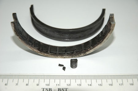 The retainer nut oil gallery ridges showed signs of heavy wear and the peaks of retainer nut threads were worn. The bearing spacer showed significant rub on the forward inner wall and on the aft inner wall. Although the spacer is considered part of the 4.5 bearing stack, it is incorporated into the high pressure turbine (HPT) shaft and rotates faster than the LPT shaft. A review of the records indicates that the 4.5 bearing had accumulated a total of 3668 hours and 2667 cycles since it was last overhauled. The rollers of the 4.5 roller bearing showed significant material loss with the flattened area facing the inner race (see Photo 4). Analysis of the 4.5 bearing components revealed that there were no pre-existing anomalies. The occurrence engine's 4.5 bearing stack, including the anti-lock washer, was reconstructed and stacked on the LPT shaft and on an exemplar shaft. Demonstrations concluded that the anti-rotation lock washer maintained its ability to retain the 4.5 bearing nut using hand pressure. TSB engineering laboratory report LP 084/2008, section 4, paragraph 4.9, concluded that the 4.5 bearing stack was intact and in place up until the LPT shaft failed.