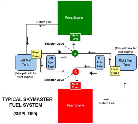 The C-337D fuel system is comprised of two outboard main-wing fuel tanks and two inboard auxiliary (aux) fuel tanks. There are two engine-driven fuel pumps which supply fuel to their respective engines during normal operations. There are also two auxiliary fuel pumps which supply fuel to the engine-driven pumps for starting and emergency operations. The design of the system is such that the auxiliary pumps can only pump fuel from the main tanks. In the event that fuel is depleted from the main tanks, operation of the auxiliary pumps will not draw fuel from the auxiliary tanks.