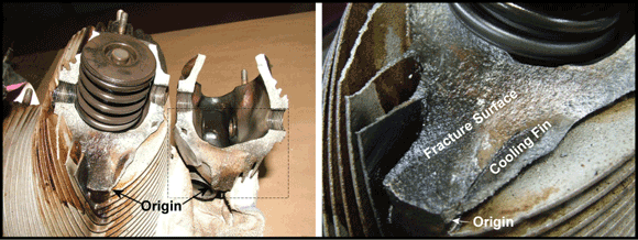 The cylinder fracture was examined under a scanning electron microscope (SEM). Casting porosity and heavy oxidation were found in several areas of the fracture surface and in the origin area of the failure. Beach marks were found that indicated that the fracture and failure occurred as a result of fatigue. The origin of the fatigue was co-located in an area of geometric stress concentration, at the corner where the cooling fin attaches to the cylinder (see Photo set 2).