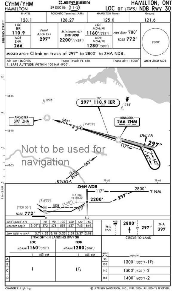 The en route portion of the flight to CYHM was uneventful. The approach preparation and briefing were completed prior to descent. The automated terminal information system (ATIS) information Echo at 2200 was reporting the weather at CYHM as VMC, with visibility 10 miles Footnote 3 in light snow showers. The crew anticipated, briefed, and later received a clearance to conduct a localizer (LOC) approach to Runway 30 (see Appendix B — Jeppesen Approach Chart (Hamilton)). It was expected that the runway would be in sight when established on final approach, prior to the final approach fix (FAF).