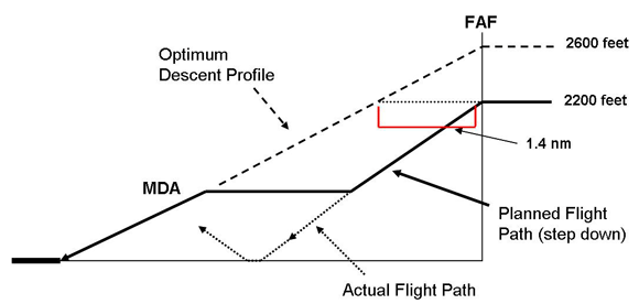 There are two techniques for conducting non-precision approaches (NPAs): the step-down and stabilized, constant descent techniques.Footnote 11 In the first instance, after crossing the FAF, the pilot descends at a rate that ensures the aircraft reaches the MDA well before the missed approach point (MAP). From there, the aircraft flies at the MDA until in a position to make the final descent to the runway. In the second instance, the pilot uses an optimum descent profile, which permits a constant rate of descent from the FAF to a point from which a landing or a missed approach is executed at the MDA.