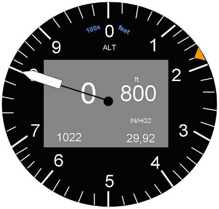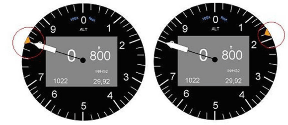 The white altitude pointer indicates altitude in hundreds of feet, subdivided into 20-foot increments, and each rotation of the pointer equals 1000 feet. The position of this white pointer in relation to the orange altimeter bug is used to determine that the aircraft is approaching a critical altitude such as the MDA. Use of this type of altitude bug, however, requires altitude awareness on the part of the crew, especially for target altitudes above 1000 feet asl.