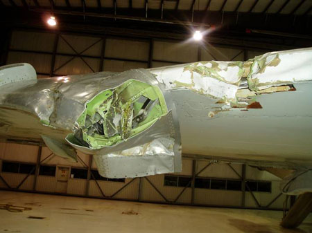 The aircraft was substantially damaged following the impact with the trees (see Photo 2). Several light scratches were found on the underside of the aircraft, running from forward of the wing root to the tailskid. Most of the damage was concentrated on the right side of the aircraft, with substantial damage to the right leading edge flaps and slats. There was no evidence of damage to the wing's front spar. The right main gear door was damaged and the right anti-skid wiring harness was severed from the brake assembly.