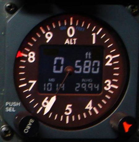 The pressure altimeter installed on this aircraft has two controls (see Photo 3). The left baro set knob is used to set the barometric pressure in millibars or inches of mercury. The right altitude index set knob is used to set the orange altitude bug or cursor on the outer scale of the indicator (in Photo 3 at 800 feet). It is used to set critical target altitudes such as the MDA.