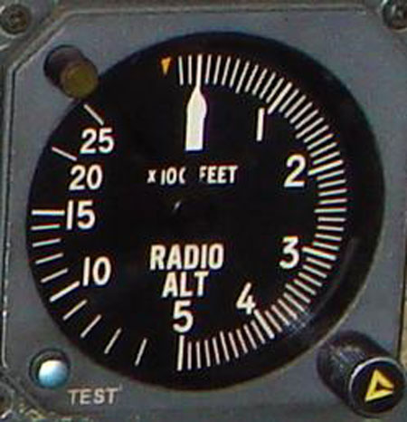 The radio altimeter (see Photo 4) displays the altitude of the aircraft above the ground. The white altitude pointer moves within a range of 0 feet to 2500 feet above the ground. The scale expands for indications below 500 feet above the ground to offer more precise readings and to increase low-altitude awareness.