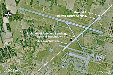 On 22 July 2008, a Kelowna Flightcraft Air Charter Ltd. Boeing 727-227 (registration C-GLKF, serial number 21118), with three crew members on board, was being operated as KFA281 on a cargo flight from Moncton, New Brunswick, to Hamilton, Ontario. The aircraft was vectored for an approach to Runway 06 at Hamilton Airport. At 2216 eastern daylight time, the aircraft touched down hard and bounced before touching down hard a second time. Immediately after the second touchdown, a go-around was initiated. During rotation, the tailskid made contact with the runway. The thrust reverser actuator fairing and the number 2 engine tailpipe made contact with the ground off the departure end of the runway. The aircraft climbed away and then returned for a normal landing on Runway 12. There were no injuries; the aircraft sustained minor damage.