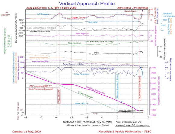 The aircraft turned onto the final approach track in descent, levelling at 2500 feet 0.2 nautical miles (nm) before the FAF. It crossed the FAF at approximately 170 KIAS; the ground speed was 200 knots. At the FAF, the aircraft began to decelerate. It could not be determined whether the crew began timing the final approach over the FAF or not. The aircraft slowed to the flap and landing gear extension speeds and began its descent 1 nm past the FAF at a descent rate of approximately 700 fpm, displaced above the desired flight path. At 3.3 nm past the FAF, the aircraft reached its target airspeed of 120 KIAS (140 knots ground speed) configured for landing. The aircraft crossed the missed approach point (MAP) at an approximate altitude of 1700 feet, 220 feet above the MDA (see Appendix C). The flight crew members were not aware that they were above the desired flight path.