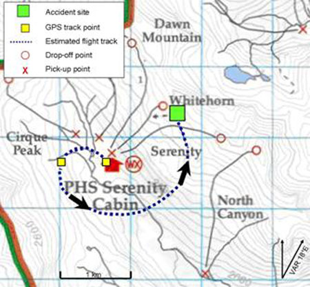 The data indicate that the route flown on the accident flight (see Figure 1) was similar to the routes flown between Serenity Cabin and the Whitehorn drop-off site on three flights completed earlier in the day. All of the approaches to the landing area were made from the southeast, across the mountainside. However, the helicopter’s rate of climb during the enroute part of the accident flight was greater than on previous flights and the approach to the drop-off site was flown at a slightly lower altitude. The last GPS data indicate that the helicopter had slowed to 30 knots (ground speed) when it was approximately 30 feet above and 900 feet southeast of the flagged site. On the previous flight to Whitehorn, the helicopter had slowed to 25 knots while approximately 95 feet above and 600 feet southeast of the flagged site.