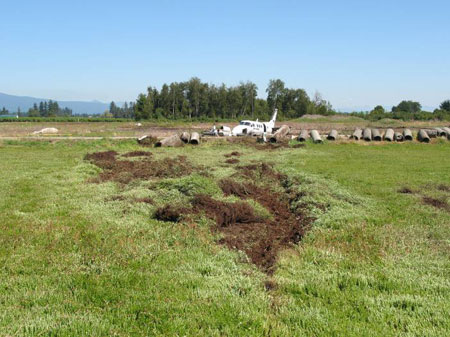 The aircraft was climbing west, away from the Pitt Meadows Airport, at 110 knots when there was a bang. The aircraft shuddered and yawed to the right. The nose was lowered to a level flight attitude, the right engine (a Pratt & Whitney Canada [PWC] PT6A-20) was shut down, and the pilot turned the aircraft left towards Pitt Meadows. The airspeed was indicating 130 knots. The left engine power lever was advanced to maximum, but there was no corresponding rise in torque (power). Left engine torque decreased until all engine power was lost. In an attempt to restart the engines, both engine auto-ignition switches were selected ON. The restart was unsuccessful. The nose was lowered to maintain airspeed, but the airport could not be reached. The aircraft touched down in a flat cranberry field bordered by three-foot-high berms (see Photo 1). On landing, the aircraft struck several of the many concrete irrigation culverts that lay on the edge of the berm. The accident site is located adjacent to the Pitt Meadows Airport at 49°13′15″ N, 122°43′45″ W, at an elevation of about 10 feet above sea level.