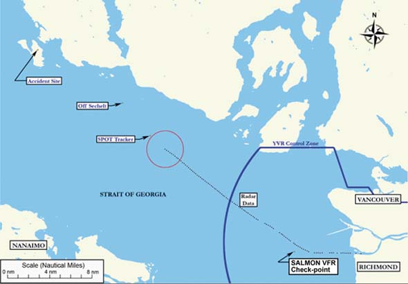 The automatic terminal information service (ATIS) issued for CYVR at 1009 reported that the wind had decreased to 8 knots and visibility had decreased to 2 sm. The pilot requested and received authorization from Vancouver air traffic control (ATC) to depart under special VFRFootnote 5 via the SALMON NORTH departure. This published VFR floatplane route requires aircraft to be equipped with an area navigation system such as a global positioning system (GPS) to identify the SALMON VFR call-up/check-point, about 6 nm offshore. At approximately 1013, the aircraft departed CAM9 westbound towards the SALMON VFR check-point. The accident flight was the only fixed-wing VFR departure from CAM9 or CYVR before 1049 that day because other operators had cancelled or delayed their flights due to the low visibility. About three minutes after take-off, approximately 2 sm east of the SALMON VFR check-point, ATC approved a right turn out of the CYVR control zone (a modification to the published SALMON NORTH departure route). At this point, the aircraft turned onto a track of about 308°T. A slight course change to the west was made after which the aircraft resumed the 308°T track until radar coverage ended. About four minutes after take-off, the pilot reported to CYVR tower that the visibility was about 2 to 2 ½ sm, and that he could probably climb to 200 to 300 feet above sea level (asl). About six minutes into the flight, and about two minutes before exiting the CYVR control zone, the pilot reported his position as 7 ½ nm from CYVR and noted that visibility had improved to about 4 sm. The majority of the route was greater than 4 nm from land or other discernable features to assist navigation. The last communication from the pilot was at about 1021, when he advised ATC that he was clear of the zone.