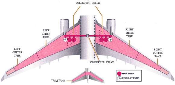 Each inner tank is equipped with 3 electric fuel pumps-two main and one standby. Inner tank levels are maintained between 3500 and 4000 kg through outer tank transfer valves that automatically cycle to allow gravity fuel transfer from the outer tanks. A collector cell located in each inner tank has a capacity of approximately 1150 kg. It provides a fuel reservoir for both main fuel pumps and ensures negative load factor protection to feed the engines. The collector cell is kept full as long as one main pump operates. A jet pump is activated by motive fuel flow from any main pump to draw fuel from the inner tank to maintain the collector cell full. Interruption of both main pumps stops the action of the jet pump and the corresponding collector cell fuel starts draining back into the inner tank until its contents equalize with the inner tank level. The equalization process may take up to 45 minutes, depending on inner tank quantity.
