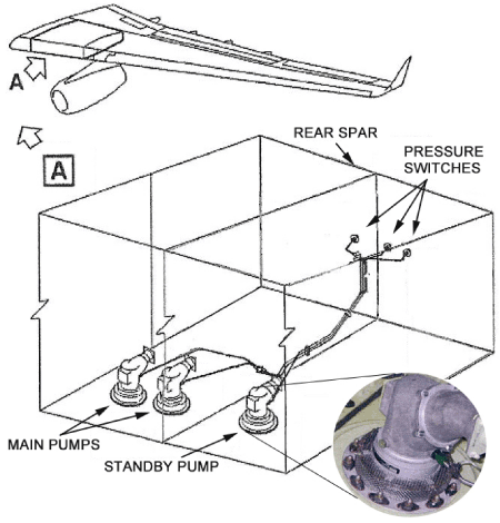 Three pressure switches (part number HTE69000-1) are co-located on the rear spar of each wing and sense the fuel pressure from each pump using separate sensing lines (see Figure 2). The switches trigger a low-pressure warning if the delivery pressure of the corresponding pump falls below 6 psi. The main fuel pumps operate continuously, while the standby pumps located outboard of the collector cell operate only when a main pump low-pressure is sensed. A non-return valve (NRV) is installed in each pump's outlet port to prevent reverse flow of fuel through the inoperative pump.