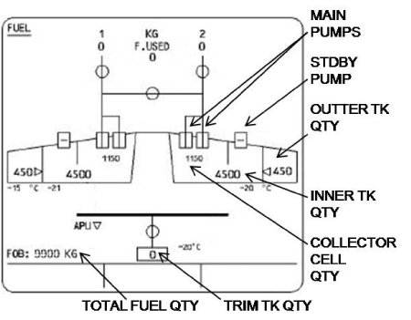 The electronic centralized aircraft monitor (ECAM) fuel page displays the fuel used, the fuel temperature, the total fuel on board, as well as the fuel quantity in each separate fuel tank (see Figure 3). The fuel quantity of the inner tank collector cell is also displayed, and is included in the inner tank quantity indication.