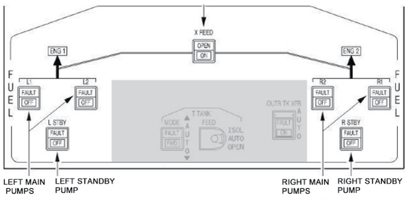 The main and standby fuel pumps are activated by push-button controls (see Figure 4) that are normally in the pushed-in position with no lights illuminated, in accordance with Airbus' dark panel philosophy. The fault light in the push-button illuminates when the delivery pressure drops below 6 psi and the OFF light illuminates when the pump is turned off.