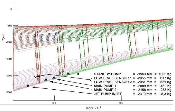 Given the wing dihedral angle, the fuel pumps are located on a different water line Footnote 27 or Z axis (see Figure 5). On the A330, the reference water line is located above the fuel tank; the references provided are negative. Two low-level sensors are located at tank heights of -2055 mm and -2081 mm. The highest low-level sensor is located 92 mm below the standby pump inlet port located at -1963 mm.