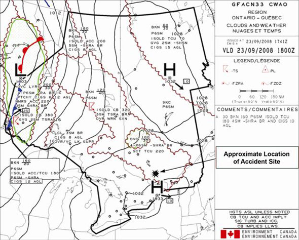 The graphic area forecast (see Appendix B – Graphic Area Forecast – GFACN33 CWAO) for Ontario and Quebec (GFACN33 CWAO) issued at 1741 ZFootnote 3 on 23 September 2008, valid at 1800 Z (1400 EDT) was as follows: