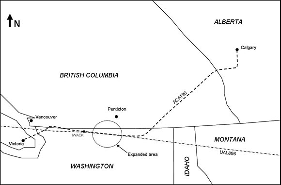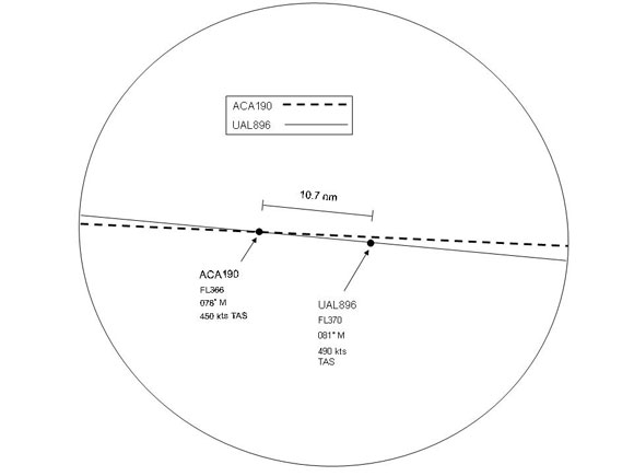At 0643, control of and communications with both UAL896 and ACA190 was transferred to Seattle ACC, who advised ACA190 that they would be cleared from FL 350 to their flight planned altitude of FL 370 when there was sufficient spacing with the preceding United flight. UAL896, at 490 knots, was cruising slightly faster than ACA190 at 450 knots. The two aircraft were on slightly diverging tracks, with ACA190 on a track of 078°M and UAL896 on a track of 81°M.