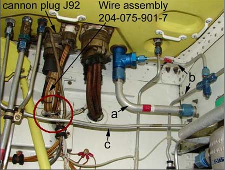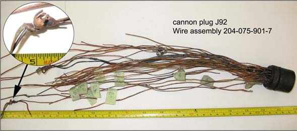 Examination of the engine electrical harness, at the juncture of the oil cooler blower compartment and the aft electrical compartment wall, revealed electrical arcing on 19 individual wires. Eleven of the 19 arced wires were located in wire assembly 204-075-901-7 running to the engine deck cannon plug J92 (see Photos 2, 3, and 4). Four of the 11 arced wires in wire assembly 204-075-901-7 were identified as to their function.
