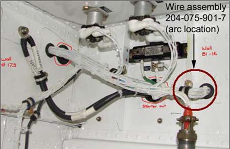 The remaining eight arced wires that were found separate from wire assembly 204-075-901-7 could not be identified as to location or function. None of the four identified arced wires in wire assembly 204-075-901-7 were associated with the wiring changes done as a result of the previous engine modification.
