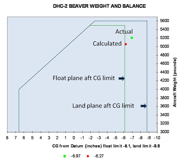 Circular slide rules were available on each aircraft for pilots to calculate the aircraft's weight and balance. The pilot calculated the takeoff weight as 5050 pounds with the CG at the floatplane aft CG limit (see Appendix A). These calculations were based on standard summer weights for the persons onboard; the baggage was estimated at 176 pounds.
