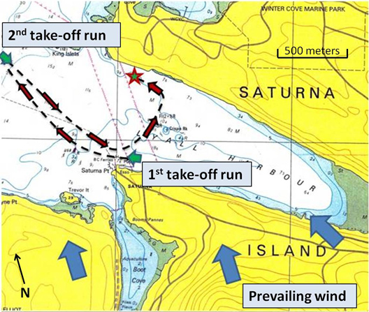 Floatplane pilots departing Lyall Harbour typically take off in a westerly to northwesterly direction, which offers an unobstructed flight path and a more favourable route to Vancouver. After unsuccessfully trying to take off in a northwesterly direction (downwind), the pilot turned the aircraft into the wind and took off towards Lyall Harbour (see Figure 1).
