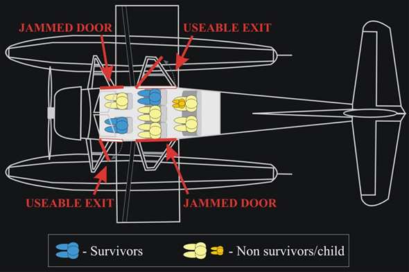 Four adult passengers had their seat belts undone. They were unable to exit the aircraft and drowned. The seating configuration is shown in Figure 2, which also indicates the useable and jammed doors.