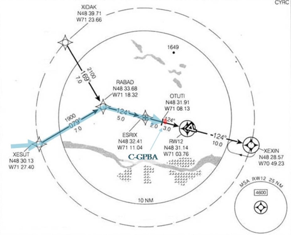 At 2230, the crew was issued the CYBG altimeter setting which was 29.34 inches of mercury; the aircraft began its descent a few minutes later. At 2240, the crew was cleared for the RNAV Runway 12 approach via the XESUT fix (Figure 1).