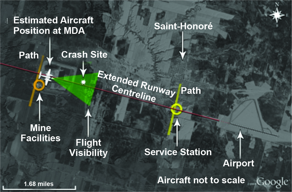 The crew travelled from Baie–Comeau to Saint–Honoré by car, covering the 325–km distance in 4 hours, in snow showers and blowing snow. As sunset was at 1549, part of the trip and all of the flight took place in darkness. The pilots flew manually on the outbound and return legs in low visibility and conditions of low–altitude turbulence.