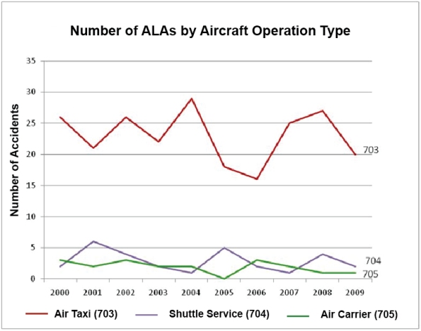 Between 2000 and 2009, TSB data indicate that the Approach and Landing Accidents (ALA) rate for commercial operations seems to have decreased only slightly and the number of fatalities has remained constant. During this period, there were 230 ALAs involving air taxi operations — on average 12 times more than were sustained by airline operations.