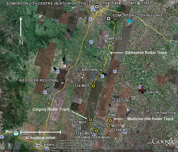 The aircraft departed from the Edmonton City Centre Airport at 1147Footnote 1 and was observed on the NAV CANADA Edmonton radar, departing Runway 30 (see Appendix A — Radar Track of C-GWUW). The aircraft remained on Edmonton radar until 1225. The flight path detailed by the radar was in a southerly direction through Camrose and past Bashaw, Alberta. Altitudes were recorded from approximately 4000 feet above sea level (asl) to 4600 feet asl. At 1237, Calgary radar picked up the aircraft in the vicinity of Drumheller, Alberta and maintained radar contact until 1243. The track recorded indicated a left turn towards the northeast. The aircraft appeared on the Medicine Hat, Alberta, radar from 1249 until 1252, approximately 42 nautical miles (nm) southwest of the accident site. The aircraft was flying at a ground speed of approximately 160 knots at 4400 feet asl, about 1500 feet above ground level (agl) at this time.