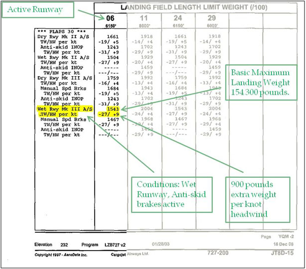 The Landing Field Length Limit Weight chart is commonly referred to as a runway analysis chart. These charts identify the maximum permissible landing weight, for a pre-determined runway, to meet the dispatch requirements of CAR 705.60(1)(a) and CAR 705.61(1). The weights in this chart are provided for dry or bare and wet runways, and include weight adjustments based on the headwind or tailwind and the availability of an anti-skid system. These charts do not provide any type of adjustment for possible runway contamination. In this occurrence, the flight crew calculated the aircraft's landing weight to be 158 600 pounds.Footnote 29 Based on the CYQM Landing Field Length Limit Weight chart, and the winds reported in ATIS Information Bravo, the maximum permissible landing weight to meet dispatch requirements for landing on a wet Runway 06 was 166 900 pounds.Footnote 30