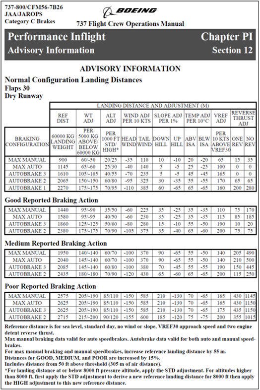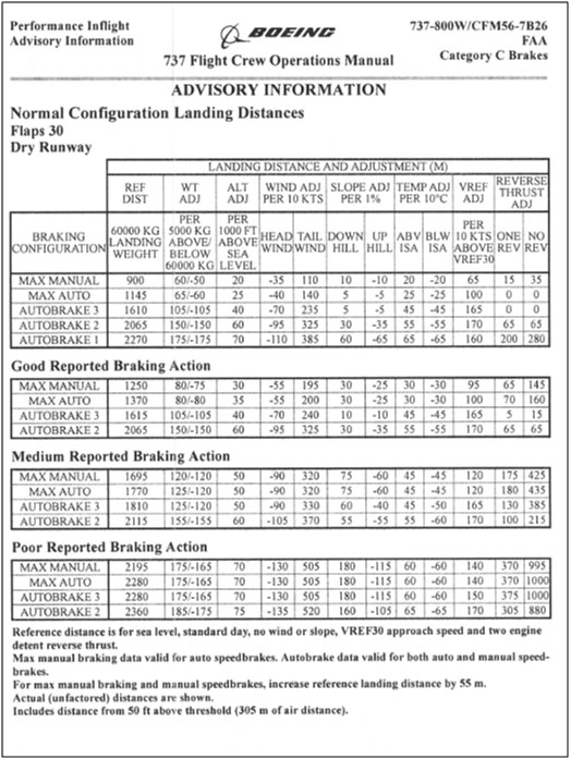 For many of its newer aircraft, Boeing manuals include advisory data, in addition to the certified data. These charts, which are based on unfactored dry landing distances, include a number of landing distance adjustments based on braking configuration, weight, wind, runway slope, temperature, touchdown speed, reversers, and reported braking action. An example of an advisory data page for the Boeing 737-800 is included in the Boeing 737-800 Flight Crew Operations Manual (FCOM) (See Appendix D). To meet JAA/JAROPSrequirements, these advisory pages have an additional 15% safety margin added to all wet/slippery (i.e., good, medium, and poor braking) landing distances (see Appendix E).