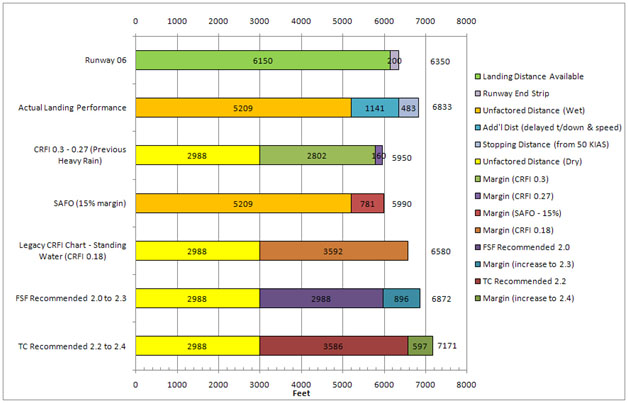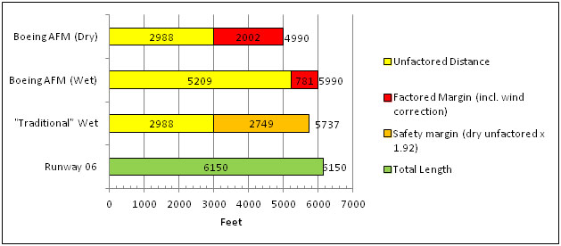 For many of its newer aircraft, Boeing produced advisory data to assist operators in determining if sufficient landing distance is available. For non–EUcustomers, Boeing advisory data does not include any type of additional safety margin; as a result, these charts provide a best case scenario given the existing conditions. As previously identified, it is unrealistic to expect that these distances will be achieved on wet runways during routine flight operations, considering the significant differences in flight profile for normal operations versus for certification purposes. Therefore, any deviations outside of the ideal approach and landing profile will likely result in significant increases in total landing distance and a reduced margin of safety. This issue has already been addressed in Europe, where advisory data provided to JAR operators must include a mandatory 15% safety margin built into the wet/slippery runway landing distances. Unfactored landing distances are not representative of routine operations and do not include any type of safety margin. As a result, there is increased risk of runway overrun if landing decisions are based on the unfactored landing distances.