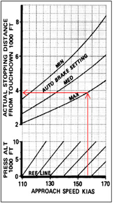 The Boeing 727-200 Operations Manual also contains an actual stopping distance chart, based on dry runway performance. This chart, which assumes no reverse thrust credit, is used on aircraft equipped with auto brakes, as a guideline to determine what auto brake setting is most appropriate for landing. As airspeed decreases during the landing roll, reverse thrusters become less effective.Footnote 22 With a touchdown speed of 157 KIAS on a dry runway and no reverse thrust credit, maximum auto brakes is required when the available stopping distance is between 3920 feet and 5210 feet (see Figure 2). At a speed of 157 KIAS, an actual stopping distance of less than 3920 feet on a dry runway would be beyond the capabilities of the auto brake system, assuming no reverse thrust credit.