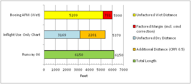 Using the information strictly from the Landing Distance Required – Inflight Use Only chart, the calculated landing distance required for a flaps 30 configuration at VREF is approximately 3169 feet.Footnote 34 Once the unfactored dry landing distance is determined, Cargojet's Flight Operations Manual and Quick Reference Handbook advises flight crew to apply the CRFI factor of 0.5 to the unfactored dry landing distance to determine the estimated runway length required with a functioning anti-skid, auto speed brakes, and thrust reversers on a wet runway. Based on the CRFI chart (see Appendix G), a CRFI value of 0.5 applied to a dry landing distance of 3169 feet gives a landing distance of 5370 feet. See Figure 3 for a comparison of the unfactored and factored wet landing distances determined using the Boeing AFM (corrected for wind and pressure altitude) to the landing distance calculated by applying a CRFI 0.5 correction to the zero wind dry runway landing distance derived from the Landing Distance – Inflight Use Only chart.