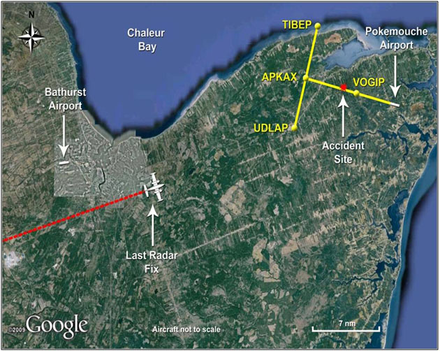 CDA4 is a registered aerodrome, located in uncontrolled airspace at an elevation of 68 feet above sea level (asl). The only published approach for Runway 13 is an RNAV (GNSS) approach (see Appendix B). The minimum safe altitude within 25 nm of the airport published on the approach chart is 1900 feet asl. Crossing the UDLAP initial entry point for the approach, an aircraft can descend to a minimum altitude of 1600 feet asl. From the aircraft’s last recorded radar position, approximately 15 nm from UDLAP at an altitude of 4400 feet asl and a ground speed of 180 knots, a descent rate of approximately 500 feet per minute would be required to cross UDLAP at 1900 feet for the GPS approach. Once an aircraft reaches APKAX, it can descend to 1000 feet asl until 4 nm from the airport, at which point the final descent may be initiated. The highest terrain between APKAX and Runway 13 is 130 feet asl. There are 2 other published approaches for the Pokemouche Airport, a GPS and a non-directional beacon approach, both on Runway 31. The descent minimum on all 3 approaches is 680 feet asl.
