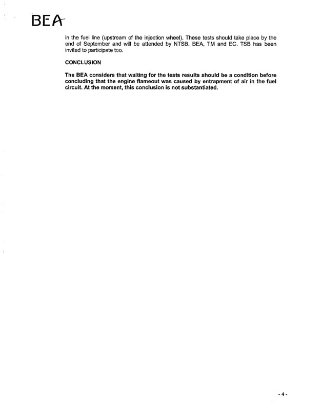 The test was carried out for 37 minutes to simulate the occurrence flight. At the end of the test, a small quantity of air was observed in the fuel line upstream of the Le Bozec airframe filter.