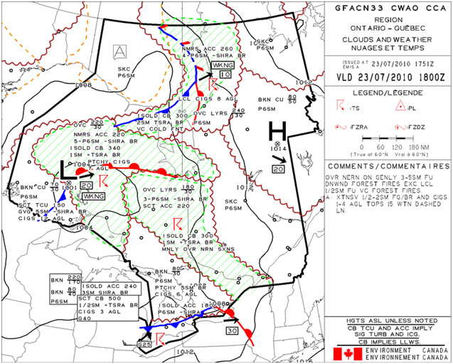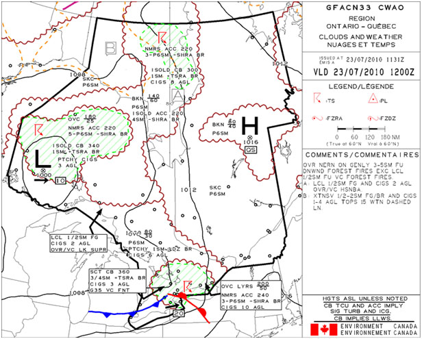 Weather information for other airports located near the route of flight, such as Sudbury (elevation 1140 feet asl, located 42 nm west of the intended track) or Earlton (elevation 800 feet asl, located 21 nm east the intended track) (see Figure 2), and the graphical area forecast (GFA) were not obtained during the telephone call. The pilot did not request a pilot weather briefing or any notice to airman (NOTAM) information. According to the flight service (FS) Manual of Operations (MANOPS) the definition of a pilot briefing at the time of the occurrence was “the provision of, or consultation on, meteorological and aeronautical information to assist pilots in preflight planning”