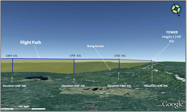 At 1338, while flying in a northwest direction, the helicopter struck the tower, at a point approximately 2⁄3 of its height, and subsequently crashed into the terrain below. There was no post-impact fire. Both occupants were wearing helmets at the time of the accident.