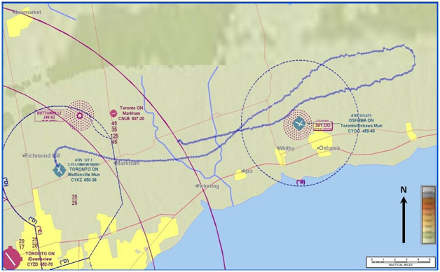 The aircraft was expected to remain in VFR conditions, climb 200 ft and maintain an altitude of 2500 feet asl while turning south to intercept the RNAV Runway 33 approach procedure. Upon reaching VIGSA the aircraft would turn northbound to a track of 333° magnetic. Once past this waypoint, the aircraft would have begun to descend to 1500 feet asl and, upon overflying waypoint LOBNI, would have contacted Buttonville tower. This is a standard published procedure for an RNAV (GNSS) Footnote 6 approach to Runway 33, which the aircraft was intending to perform.
