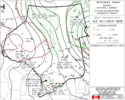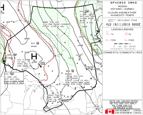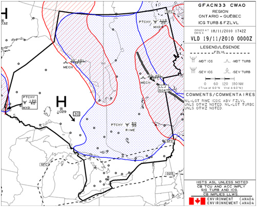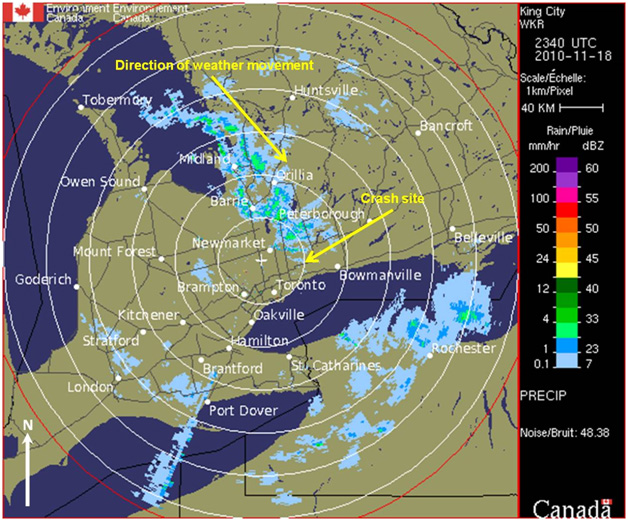 Environment Canada radar indicated precipitation in the form of rain moving in a southerly direction towards Lake Ontario from Lake Huron. The graphical area forecast (GFA) clouds and weather forecast for Ontario region valid at 1900 hours, forecasted isolated towering cumulus clouds, 2 statute miles visibility in light snow showers with a ceiling of 1000 feet agl over and off Lake Huron. The GFA icing turbulence and freezing forecast issued at 1242 and valid at 1900 showed no icing being forecast with a freezing level at 2500 feet asl. A second GFA issued at 1832 and valid at 1900 showed moderate mixed icing between 3000 to 9000 feet asl. This forecast was not available prior to the aircraft departing CYKZ. Although no PIREPS were received prior to the occurrence, aircraft in the vicinity and at an altitude of 2500 agl, were encountering light icing conditions with mixed precipitation, and a temperature of approximately − 2°C.