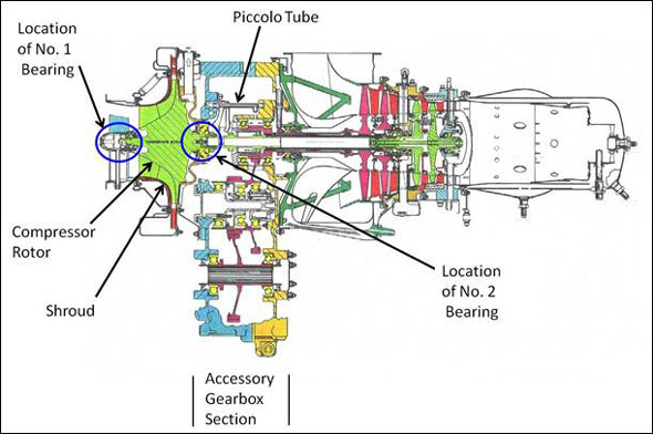 An examination of the engine (serial number CAE-848126) determined that the No. 2 bearing, (part number 23009670, serial number MP001190), which supports the aft end of the compressor, had failed (see Figure 1).
