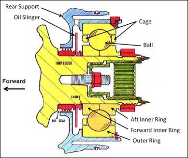 The forward end of the compressor rotor is positioned radially by the No. 1 bearing, a small roller bearing supported inside a housing on a thin film of oil. This oil film damped installation allows a small amount of radial movement of the bearing within the housing to help reduce vibration. The aft end of the rotor is supported by the No. 2 bearing, a large ball bearing designed to take combined radial and axial (thrust) loads as well as accommodate small amounts of angular misalignment. Angular misalignment in the No. 2 bearing can occur in part because slight radial movement is allowed in the No. 1 bearing. The angular misalignment in the No. 2 bearing results in moment loads.
