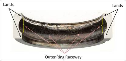 The raceways of the inner rings were burnt and covered with coked oil, precluding detailed examination of surface wear damage. Circumferential skidding marks were most severe on the aft inner ring raceway, and much of the material that formed the shoulder, that part of the raceway curvature nearest the land, was missing.