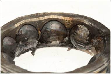 Large ball excursions can result in high ball-to-raceway contact stress, spallingFootnote 5 of the balls and raceways, and cyclical loading of the cage leading to fatigue cracking. If the cage cracks, the loss of hoop continuity allows it to expand radially, thus resulting in interference with the guide land and restraining the balls from rolling. If the excursions are large enough that the balls run completely off the raceway, scoring and grooving of the balls will occur. This results in ball skidding, overheating, metal generation and rapid bearing failure.