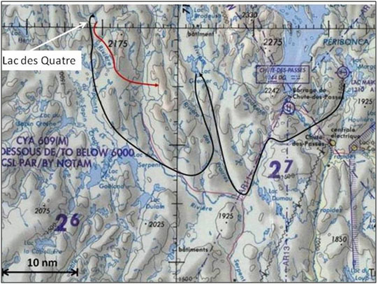 At 0950, the pilot took off from Lac Grenier and landed on Lac des Quatre after a flight lasting approximately 30 minutes. When it arrived at Lac des Quatre, the aircraft seemed to emerge from the clouds before landing on the lake. The linear distance between the 2 lakes is 10 nm, and the normal flight time, in a straight line, is less than 10 minutes.