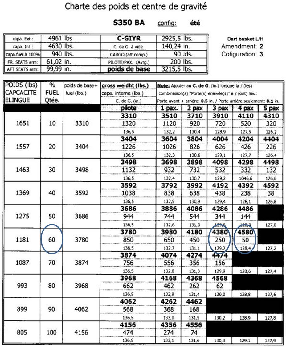 Hydro-Québec's initial charter request was for an AS350-B2 to carry 4 passengers and 300 pounds of baggage. The AS350-B2 has an empty weight similar to that of the AS350-BA but a maximum allowable take-off weight of 330 pounds more, i.e., 4960 pounds. According to the AS350-B2 weight chart, with fuel tank at 60% capacity and 4 passengers on board, the aircraft can carry no more than 272 pounds of baggage.