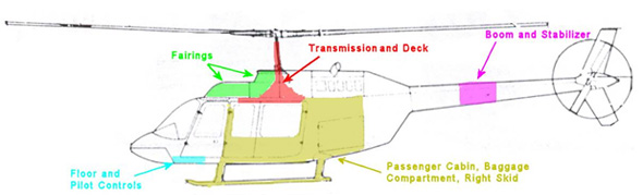 Figure 1 shows the recovered sections of the helicopter. The engine, most of the cockpit, and most of the tail section were not recovered (see Photo 2). The fracture surfaces observed on the recovered sections were attributed to overstress as a result of water impact. The degree of helicopter break-up and damage to the recovered sections indicate an impact at a speed in excess of that associated with an emergency landing.