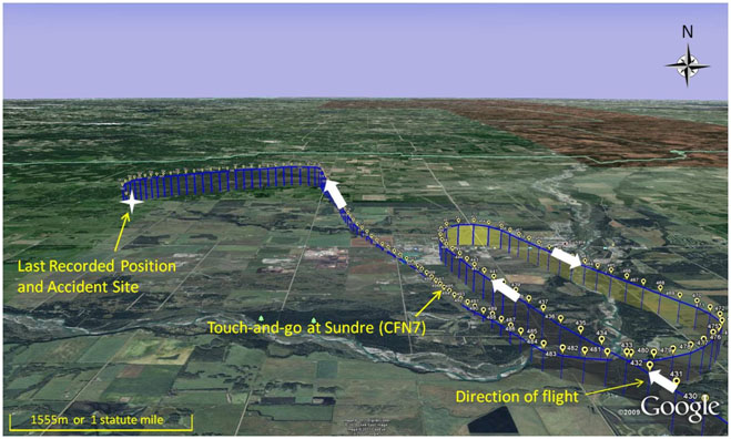 The aircraft departed Springbank (CYBW) at 1319, Footnote 1 for a planned 1.5 hour flight. The aircraft travelled northwest toward the Sundre Airport (CFN7), 40 nautical miles (nm) north of Springbank, at a maximum altitude of 6500 feet above sea level (asl), and a maximum ground speed of 160 knots. A descent was commenced 21 nm southeast of CFN7. Due to terrain masking, the last air traffic control radar return produced by the Calgary radar source, at 1336, showed C‑FGLA descending through 5700 feet asl.